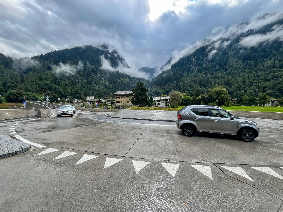 Promontogno und Bondo (rechts) von Sottoponte aus gesehen mit den drei neuen Brücken und dem Auffangbecken am Zusammenfluss von Bondasca und Maira.