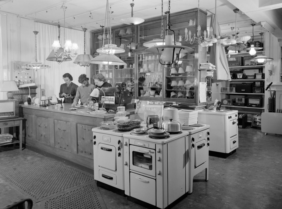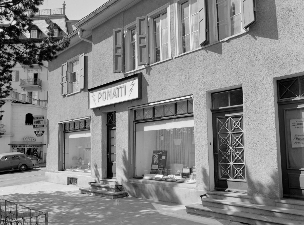 Das vormalige Verkaufsgeschäft der Firma Pomatti in St. Moritz mit Anita Pomatti-Riz à Porta (links). Fotos: Dokumentationsbibliothek St. Moritz/Andreas Pedrett/Copyright Max Galli