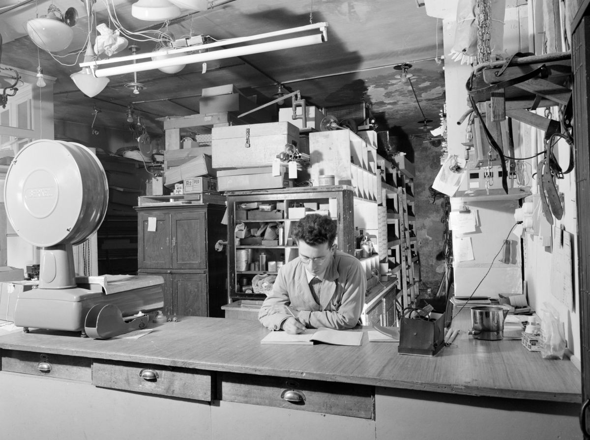 Herr Brupbacher, der Schwiegersohn von Antonio Pomatti, im Magazin der Firma Pomatti.