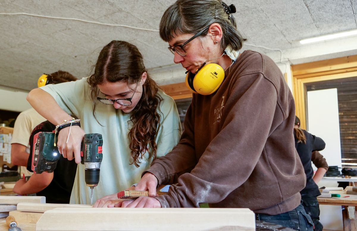 Blick in die Werkstatt der Schreinerei Pichalain in Fuldera, wo am Donnerstagnachmittag Schülerinnen und Schüler unter fachlicher Anleitung die Arbeit an ihrem Skibob weiterführten.