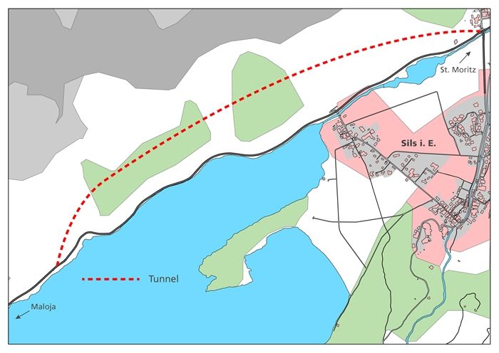 Das Nordportal des geplanten Tunnels würde in der Nähe des heutigen Kreisels am Eingang von Sils Maria in den Berg führen. Grafik: Standeskanzlei Graubünden