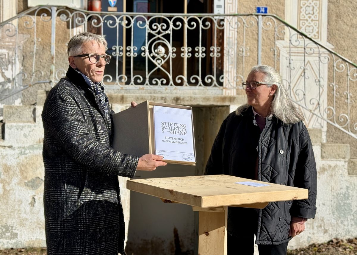 Stiftungspräsident Herbert Schmid und Stiftungrätin Mengia Mathis beim symbolischen Akt. Foto: Fadrina Hofmann