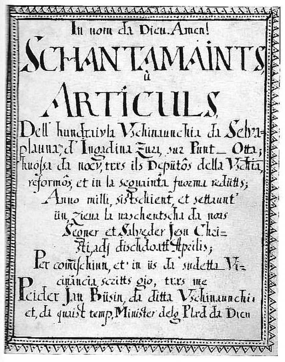 Dorfordnung von Silvaplana, 1671. Die erste überlieferte Dorfordnung ist noch älter: jene von Bever stammt aus dem Jahre 1584. Quelle: Rechtsquellen des Kantons Graubünden.