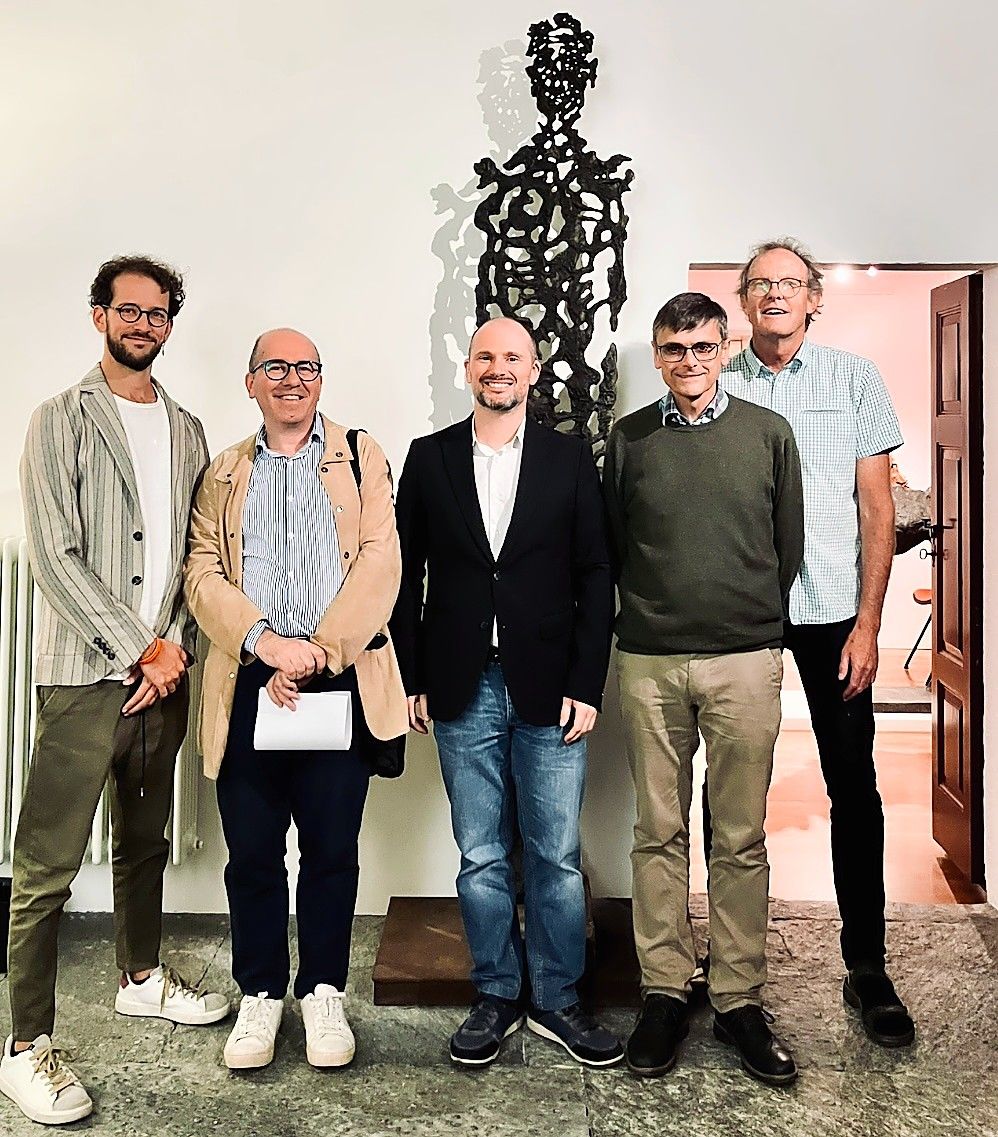 Junge Kulturschaffende vor Giuliano Pedrettis Skulptur «Der grosse Mann». Ulrich Suter ist der zweite von rechts. Foto: Fundaziun Crasta
