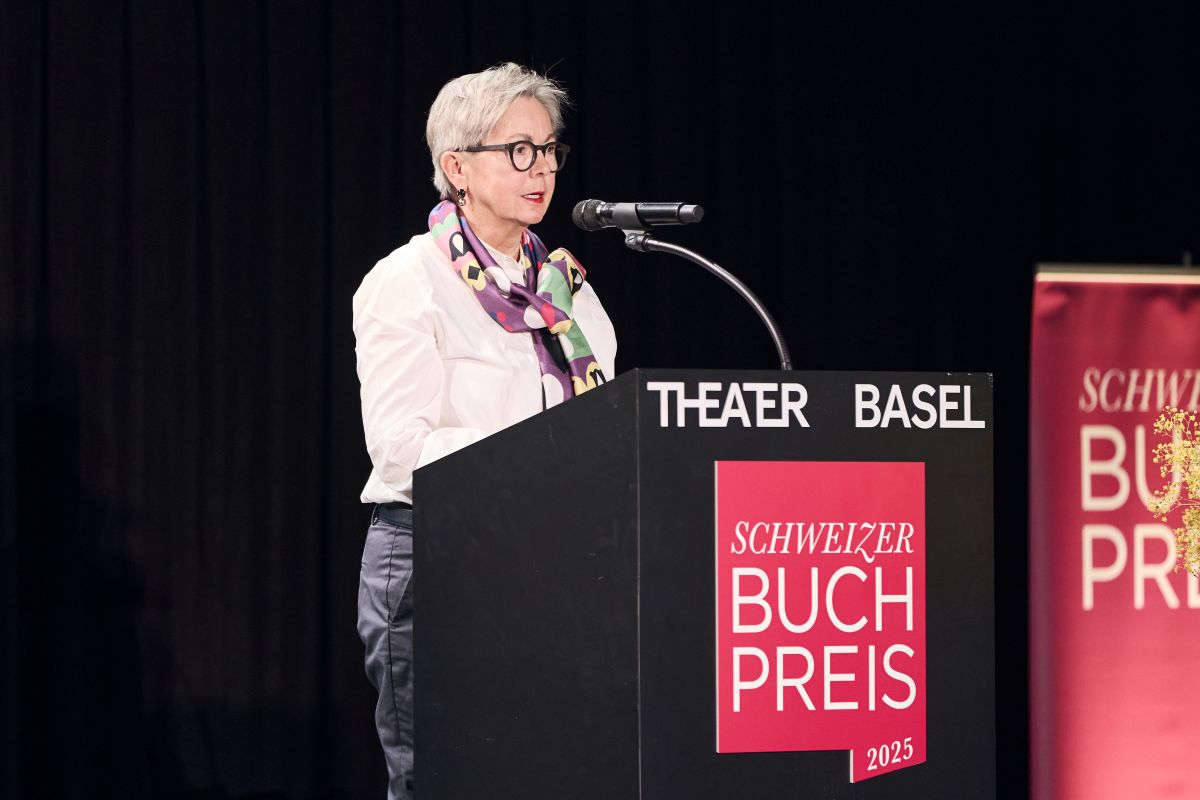 Simone Nuber von der libraria poesia clozza in Scuol am Schweizer Buchpreis 2025 in Basel. Foto: Samuel Bramley, Buch Basel