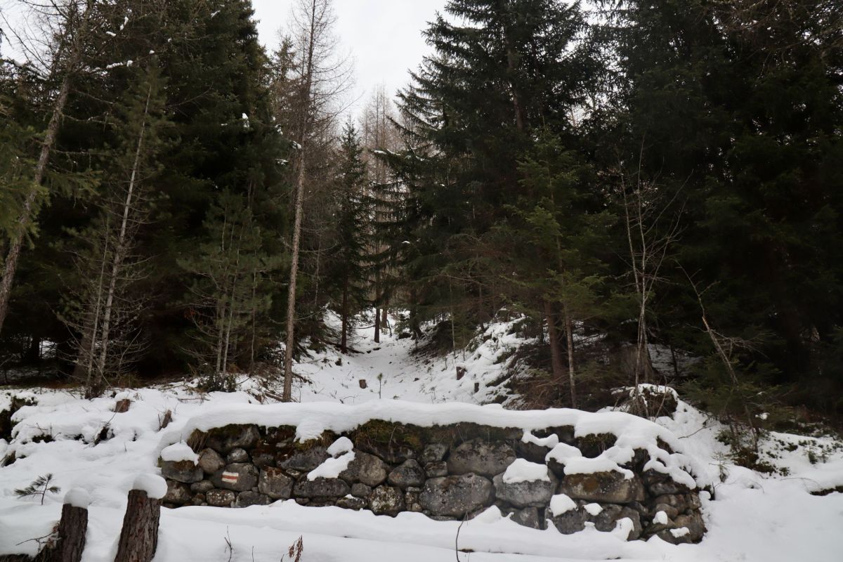 Las restaunzas da la schanza d’Arpiglia a Zuoz cul muot da saglir in mür sech (fotografia: Martin Camichel).