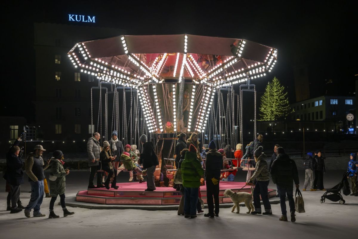 Wer ein sich schnell drehendes Karussell wie auf einer Chilbi erwartet hatte, musste schnell erkennen, dass Carsten Höller genau das Gegenteil installiert hatte. Ein Karussell, ganz in rosa, mit vielen Lichtern und hängenden Sitzplätzen. Es dreht sich sehr sehr langsam und gibt den Interessierten Zeit, zu entschleunigen, das Eisfeld und den Kulm-Park zu betrachten und in sich zu gehen.