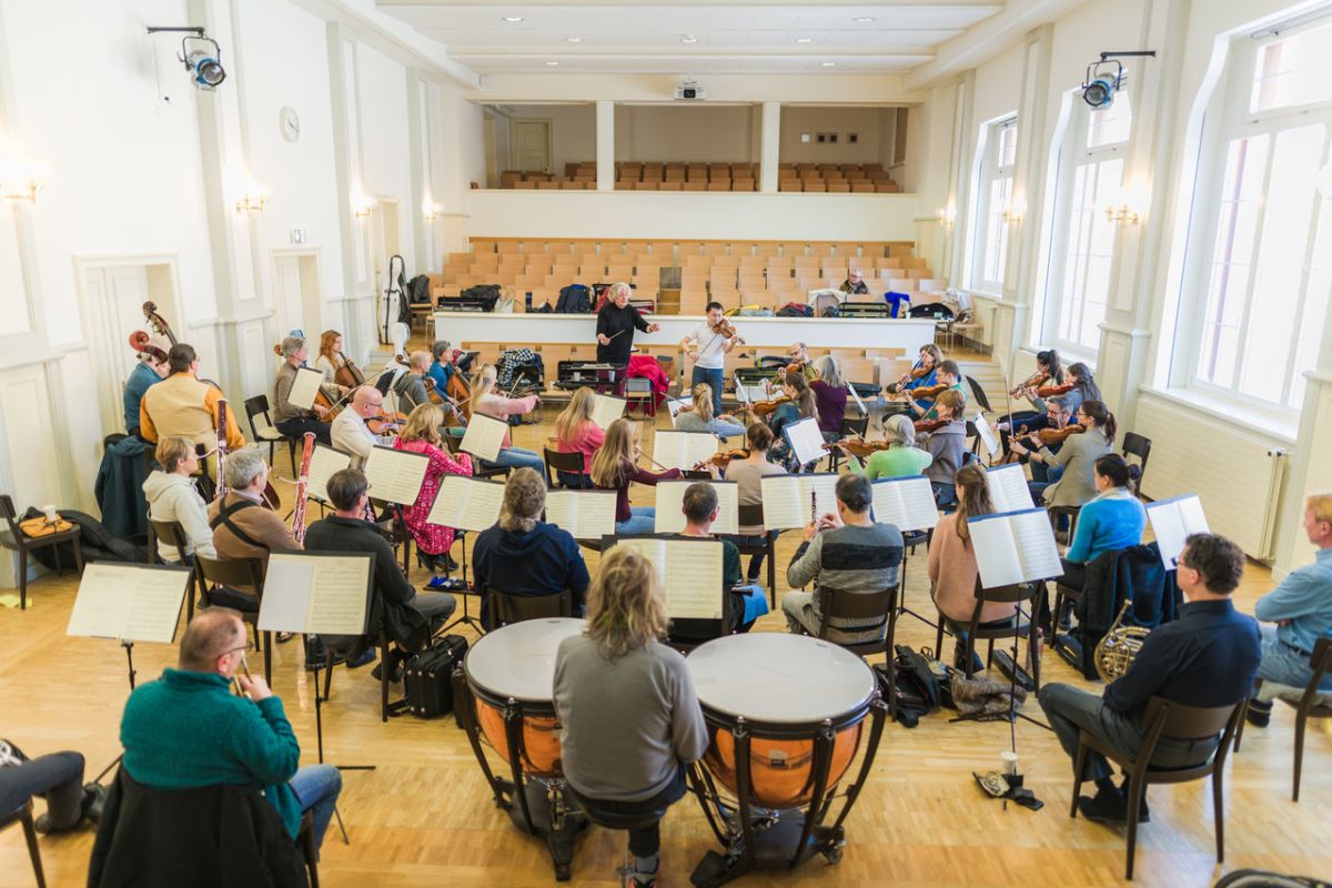 Das Sinfonieorchester Oberengadin 2024 während den Proben im Lyceum Alpinum in Zuoz. Foto: Dennis Yulov