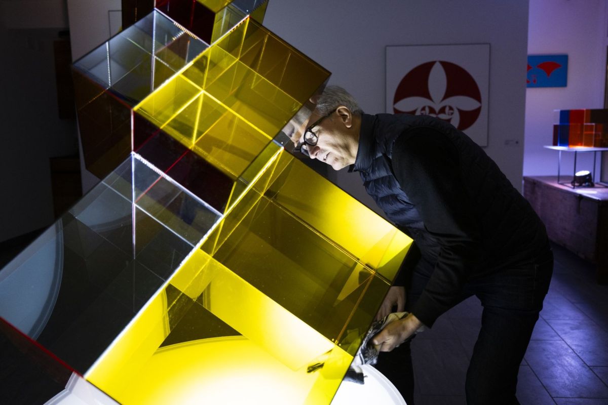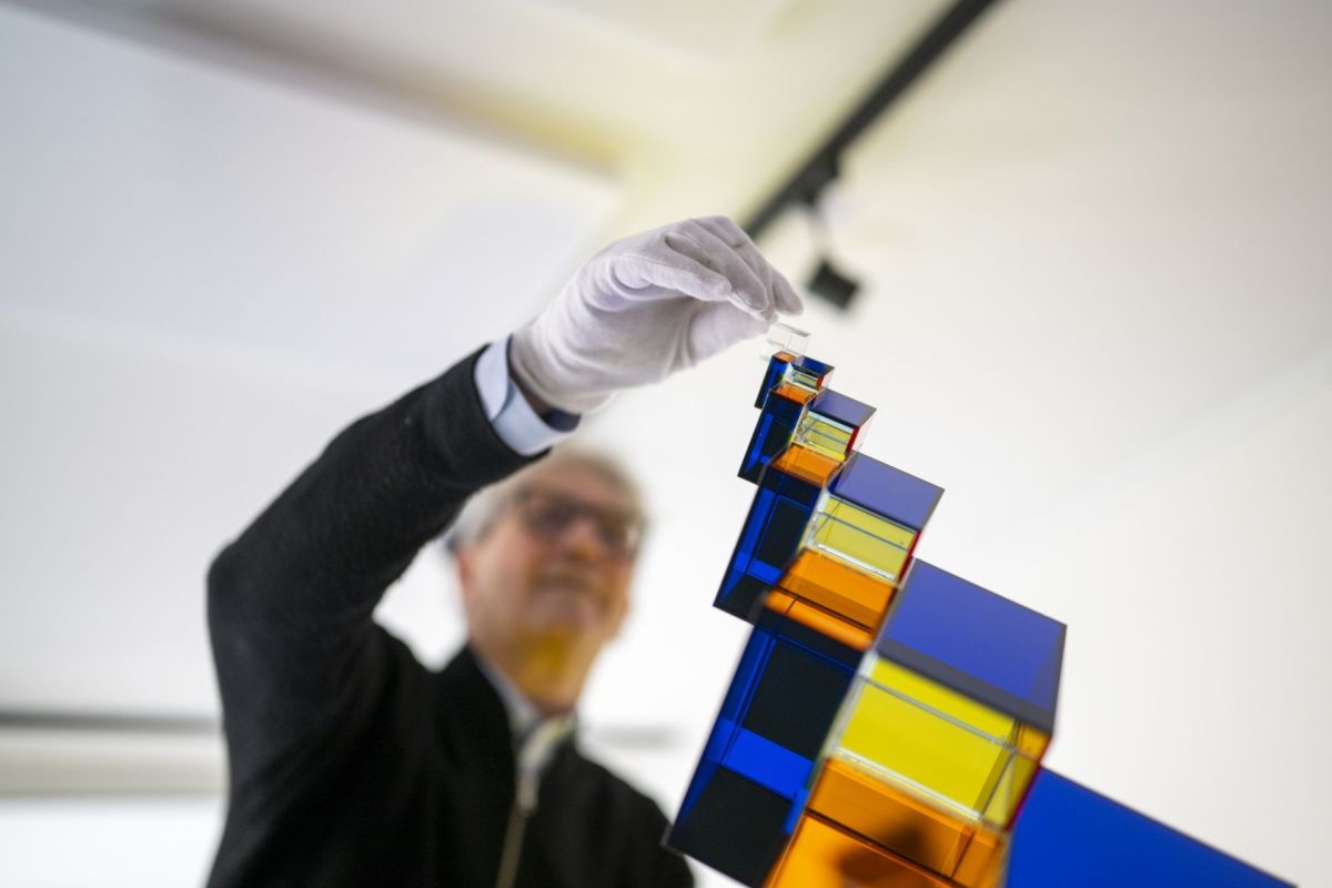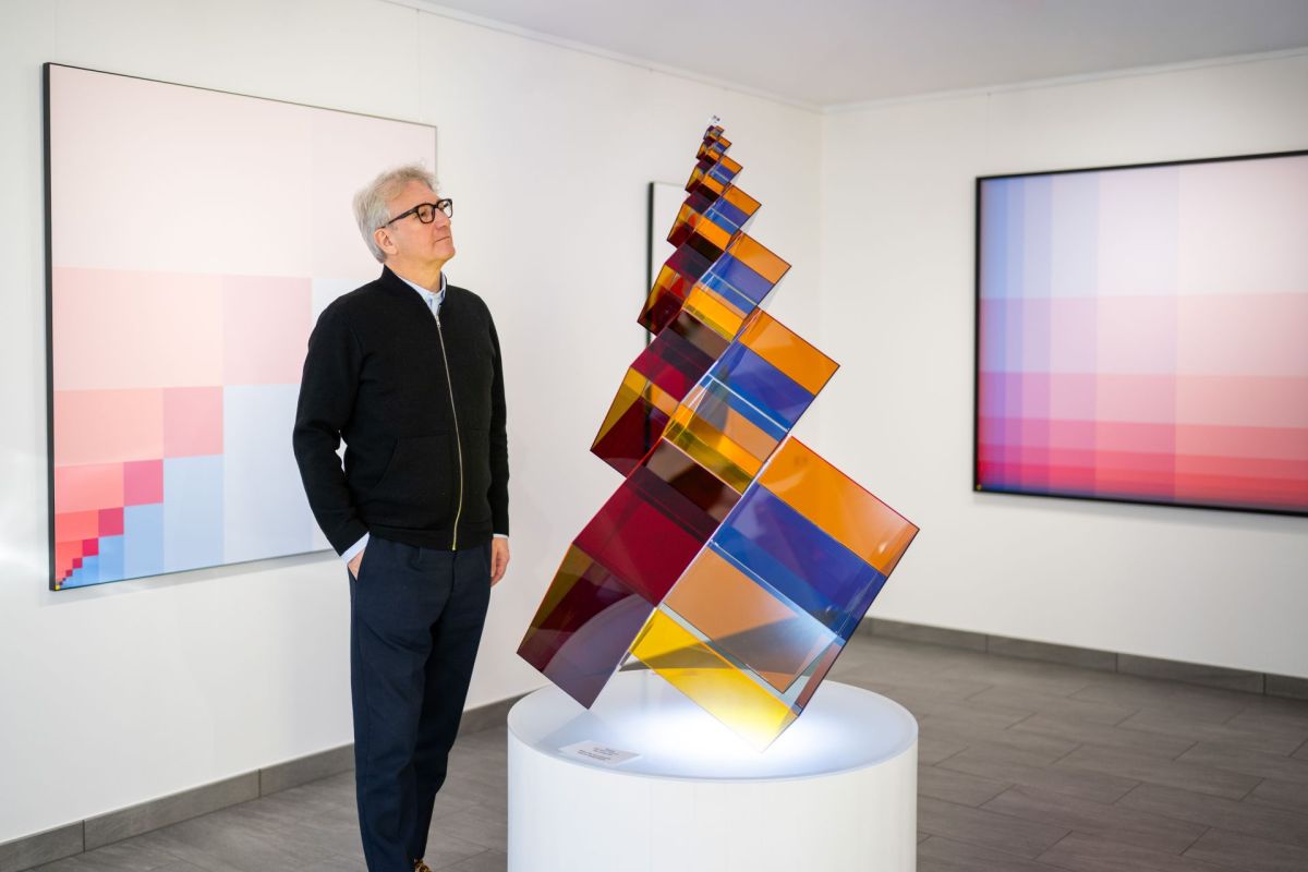 Gauthier Cerf mit seiner «Fibonacci Pyramid» und anderen Werken in Scuol. Er spielt selber Klavier und findet, vorab in der Musik Bachs, viele Parallelen zu seiner Kunst. Fotos: Mayk Wendt
