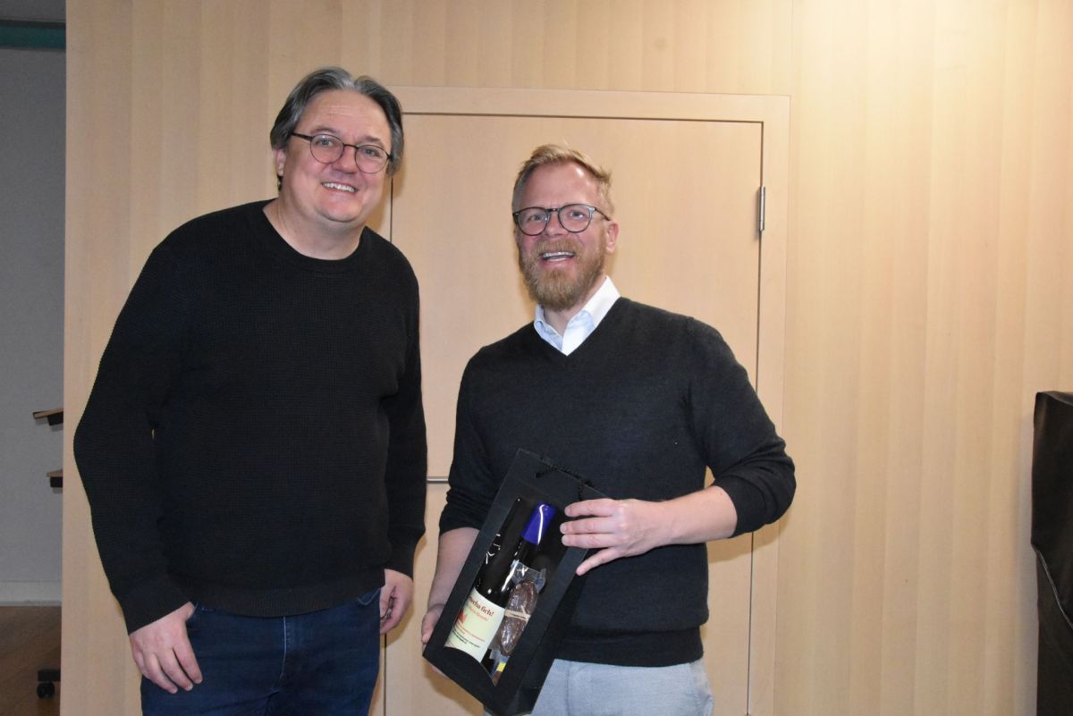 Il president da la Società da commerzi e mansteranza Engiadina Bassa, Jon Armon Strimer (a schnestra), ed il referent Gian Marco Bianchi in occasiun dal aperitiv da Büman a Scuol (fotografia: Nicolo Bass).