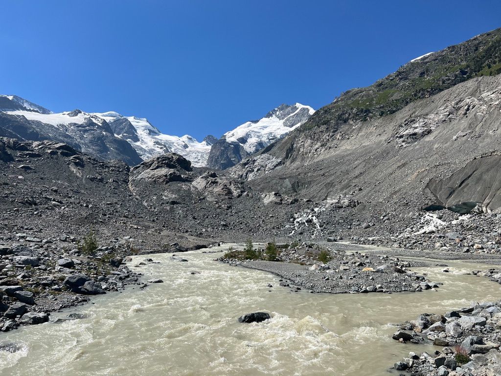 Die Forschenden nehmen Wasserproben vom Morteratschgletscher bis zum Inn in Martina. Foto: Timo Rhyner