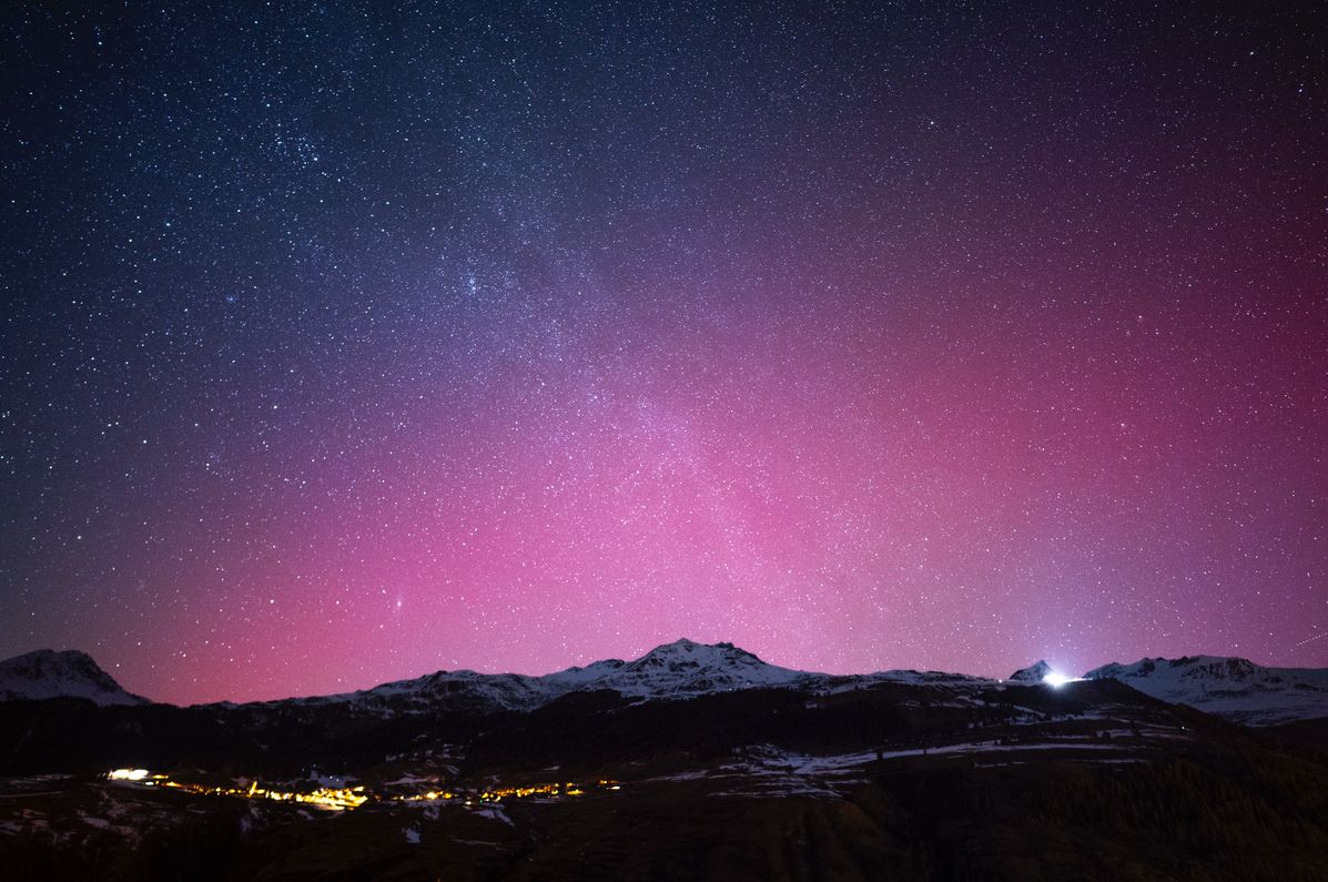 Ein starker geomagnetischer Sturm der Stufe G4 hat die Erde am Montagabend um 20.38 Uhr erreicht. Je höher die Stufe (G1 bis G5), desto stärker sind Polarlichter. Sonnenstürme können Störungen bei Satelliten, GPS, Funkverbindungen und Stromnetzen verursachen. Gemäss weiteren Angaben des SWPC handelt es sich beim aktuellen Naturphänomen um ein Sonnenstrahlungssturm der Stufe S4 (S1 bis S5). Polarlichter entstehen, wenn Teilchen eines Sonnensturms auf das Magnetfeld der Erde treffen. Die Polarlichter kommen am häufigsten nördlich oder südlich der jeweiligen Polarkreise vor, also in den polaren Gebieten. Die Farben hängen davon ab, in welcher Höhe der Atmosphäre die Teilchen auf Sauerstoff oder Stickstoff treffen: Grüne Polarlichter entstehen in niedrigeren Schichten (ca. 100 Kilometer Höhe) und sind in den Polarregionen am häufigsten, während rote Polarlichter in höheren Schichten (ab etwa 200 Kilometer Höhe) leuchten. Bei uns sieht man in klaren Nächten eher rote oder rötlich-rosa Lichter, wobei an manchen Orten dieses Mal auch grünliche Polarlichter fotografiert werden konnten. Zu beachten ist, dass ein schwächeres Polarlicht meist nur durch die Kamera und nicht mit blossem Auge sichtbar ist. Da die Sonnenaktivität inzwischen wieder zurückgegangen ist, sinkt die Wahrscheinlichkeit für die Sichtung von Polarlichtern in unseren Breitengraden wieder drastisch, schreibt das Bundesamt für Meteorologie und Klimatologie Meteo Schweiz. Das Foto wurde im Unterengadin aufgenommen, mit Blick auf Ftan, Piz Clünas und Motta Naluns.
