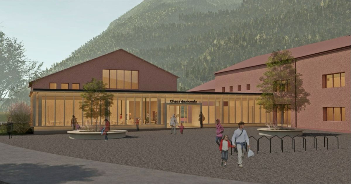 Üna prüma visualisaziun da l’entrada da la scoula sanada a Müstair. La culur cotschna gnarà rimplazzada dad üna culur verda plü clera. fotografia: Cumün da Val Müstair