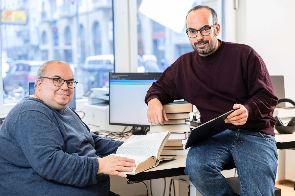 Gion-Andri (a schnestra) e Martin Cantieni han realisà ün program da correctura per tuot ils idioms e per rg (fotografia: Bernard van Dierendonck).