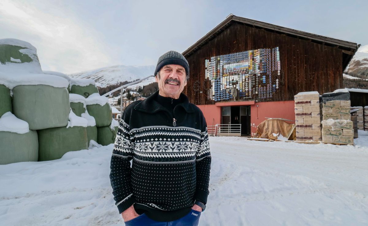 Duri Casty a Zuoz davaunt sia stalla da bês-cha, decoreda cun tuot las plackettas da sias partecipaziuns al Concours Hippique da Zuoz. fotografia: Jon Duschletta