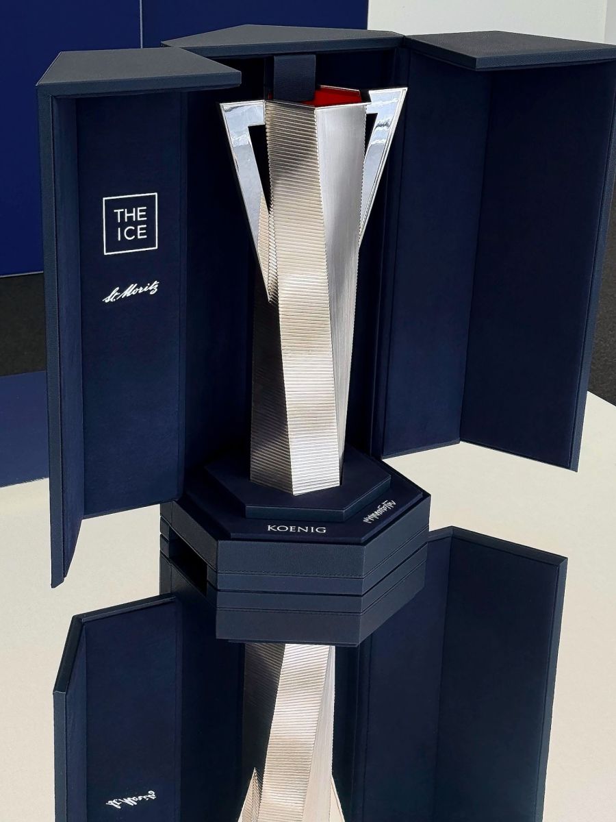 Es riecht nach Metall und Polierpaste, die Luft ist warm. In einer Ecke des Ateliers der Familie König in Celerina stehen zwei Gasbrenner, daneben eine massive Werkbank. Darauf: ein Objekt aus Silber, kantig und zugleich in Bewegung. Kein klassischer Pokal, kein glatt poliertes Symbol des Sieges. Sondern die «Best in Show Trophy» von The I.C.E. St. Moritz. Gefertigt wurde sie hier, im Engadin, in über 300 Stunden Handarbeit. Entworfen hat sie kein Geringerer als der britische Architekt Lord Norman Foster. Umgesetzt wurde sie von einem Betrieb, der sonst Schmuckunikate herstellt.