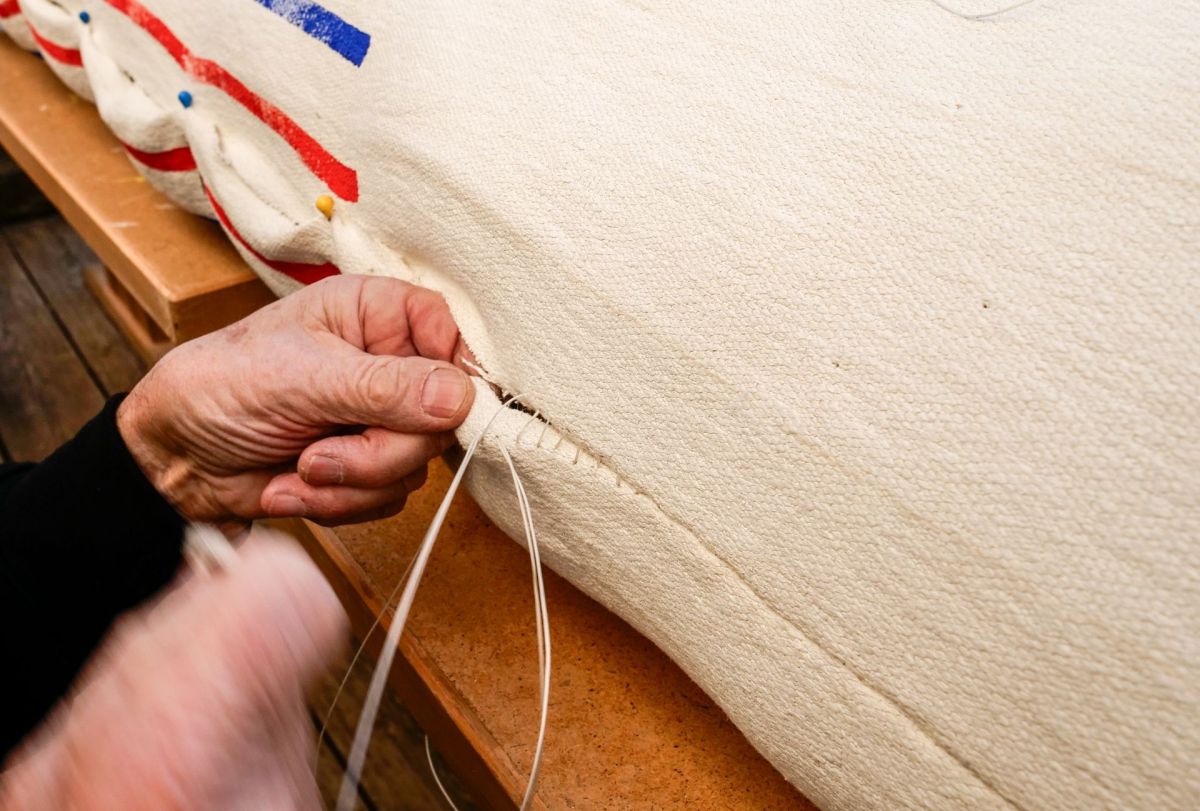 Oskar und Daniel Heer helfen Philine Rinnert die zweite Leinenbahn auf die Rosshaarfüllung zu legen. Foto: Jon Duschletta
