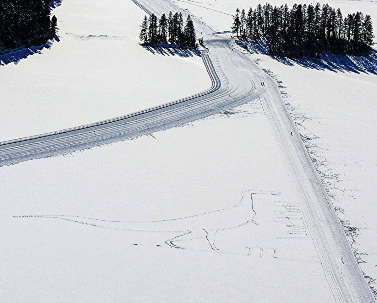 Der Plateosaurus, auch Breitweg-Echse genannt, entstammt der Gattung der sauropodomorphen Dinosaurier als typus- und namensgebende Gattung der Plateosauridae-Familie. Funde dieser Art stammen laut Wikipedia aus der Obertrias, vor allem der Mitteleuropas, und sind zwischen 201 und 217 Millionen Jahre alt. Ein erwachsener Plateosaurus wurde zwischen vier und zehn Meter lang und konnte ein Gewicht von 600 bis zu 4000 Kilogramm haben. Zur Erinnerung: Marianne Steiger stapft ihre riesigen Schneefiguren einzig anhand einer einfachen Handskizze und ohne weitere Hilfsmittel in die Schneeoberfläche. Dass heuer zwischen dem Zeitpunkt der Erschaffung des Plateosaurus und der Fotoaufnahme noch eine unbekannte Person «I love St. Moritz» neben den Saurier in den See gestapft hat, darf durchaus als Kompliment aufgefasst werden, ein analoger Chat sozusagen.