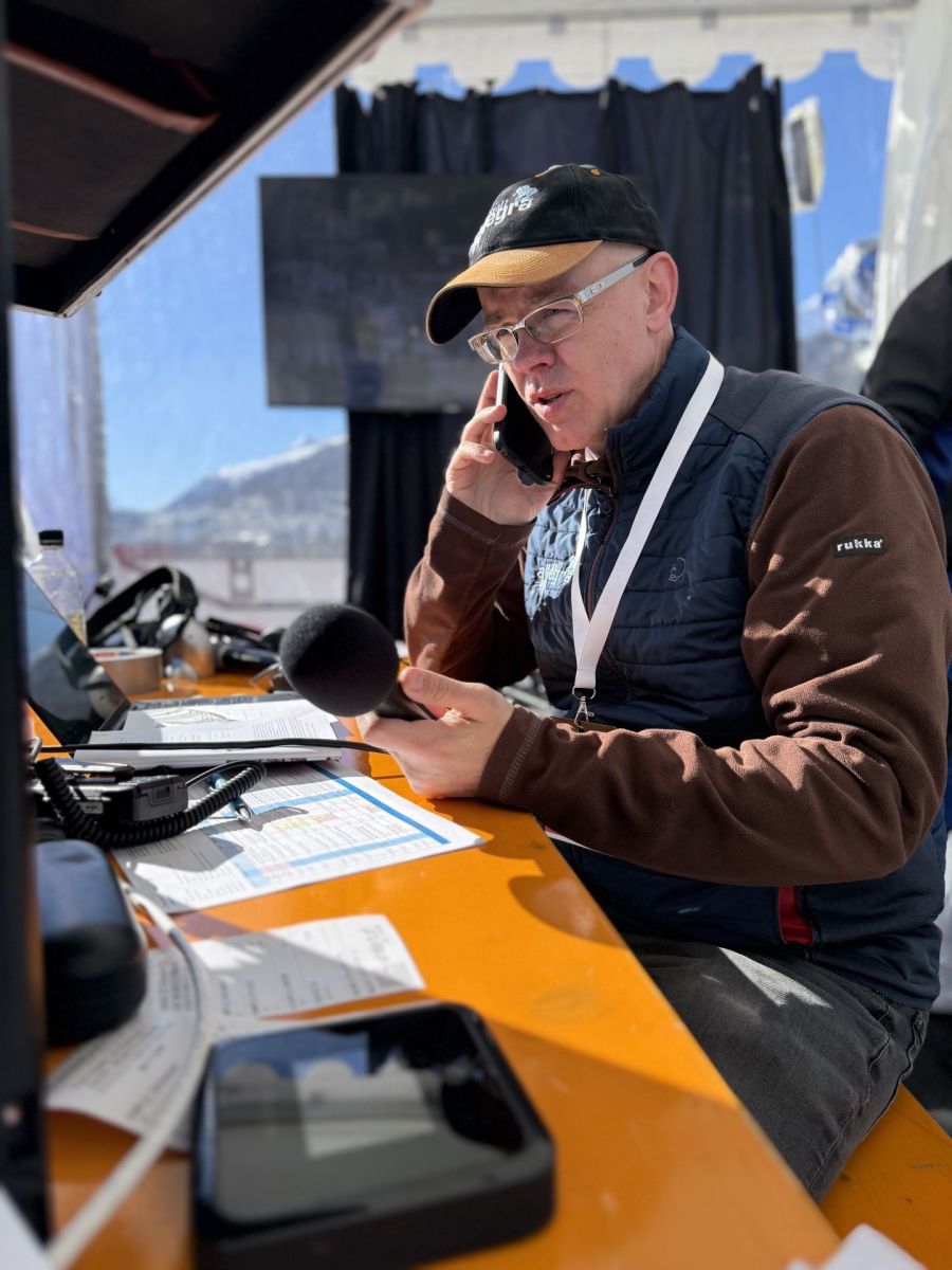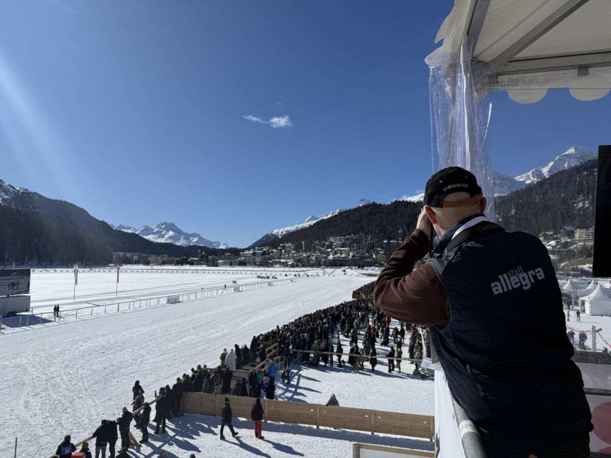 Nachdem am ersten Rennsonntag gleich drei Siege des Allegra-Teams gefeiert werden konnten – darunter im Skikjöring mit der Pontresinerin Valeria Selina Walther und Pferd Almacado Gree – gibt es Hoffnung auf weitere Podestplätze. Doch zunächst ist für Markus Monstein Arbeit angesagt. Ausgerüstet mit Funk, Laptop, Mobiltelefon und Papierunterlagen bereitet er sich auf das Skikjöring-Rennen vor. Das Headset, das er normalerweise als Rennspeaker trägt, funktioniert an diesem Tag nicht, also muss ein Mikrofon her. In drei Sprachen kommentiert er das Geschehen vor Ort, wobei er während des Rennens Hochdeutsch spricht.