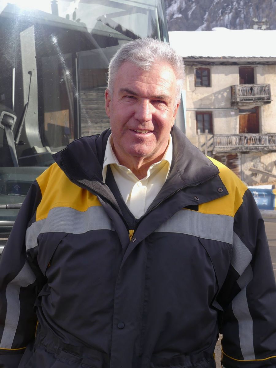 Il manisunz da posta Jachen Tschenett dürant üna cuorta posa pro la staziun da bus a Livign. fotografia: Dario Müller