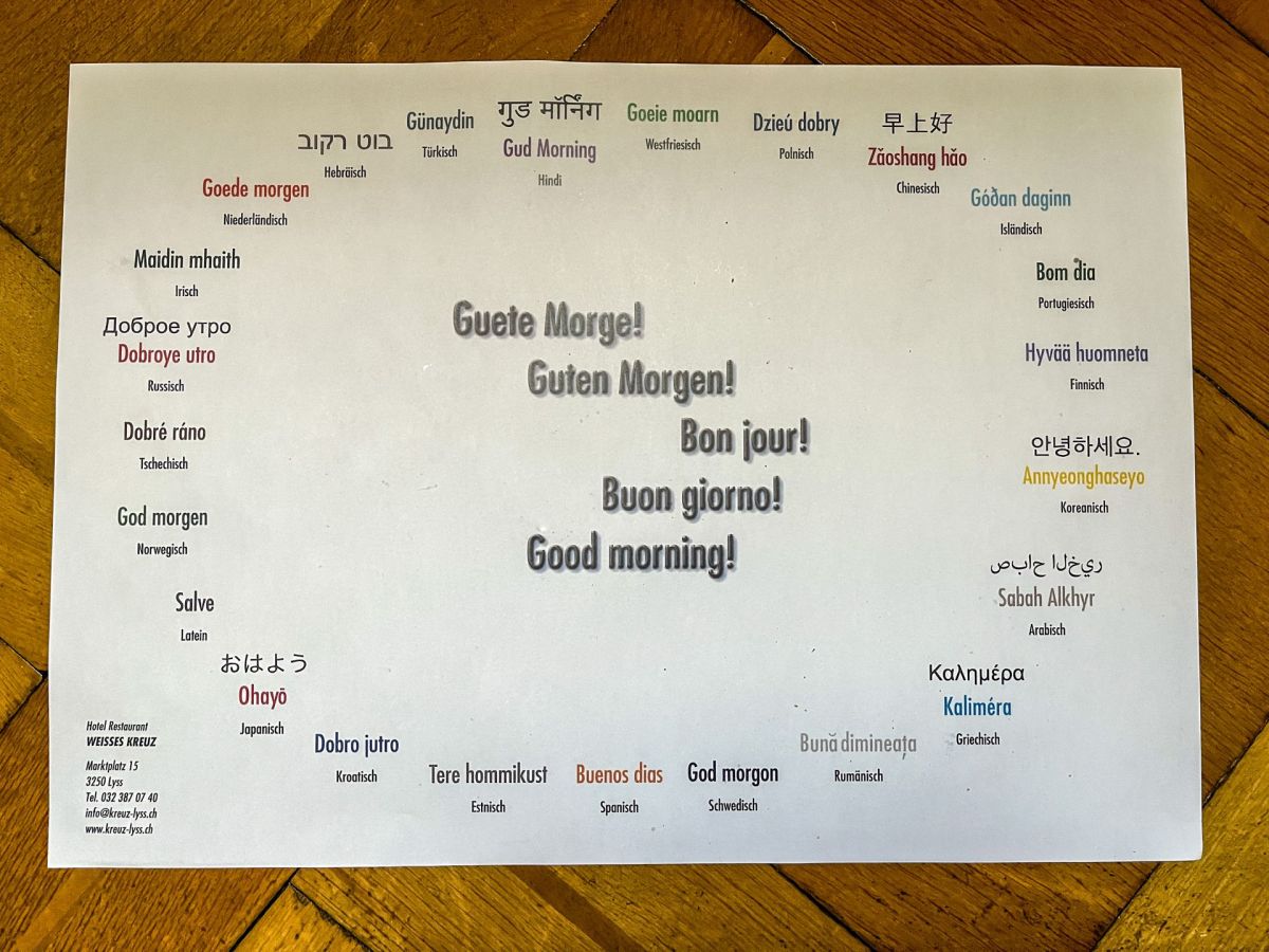 Ma vairamaing leiv quintar quist’istorgietta: 2025, fin d’eivna d’utuon a Lyss illa cuntrada da lais bernaisa. Nus giodains il temp in duos, l’hotel e sias comoditats sco eir las spassegiadas tras ils minzs da Lyss ed Aarberg e lung la riva da l’Aare veglia. La dumengia bunura ans spetta la maisa pronta pella culazchun cun ün set da palperi chi’ns giavüscha ün s-chet «bun di» in 29 linguas e dialects da tuot il muond. Che simpatic! Da «Maidin mhaith» in irlandais sur «Ohayõ» in giapunais e «Góðan daginn» in islandais fin «Annyeonghaseyo» in korean o «Kaliméra» in grec.