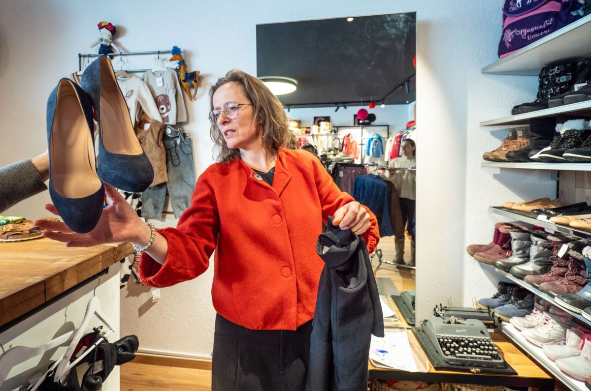 Mitarbeiterin Nadja Gonzalez ist oft im Kinderkleiderladen anzutreffen und hilft Laura Peka im Verkauf und der Warenannahme. Foto: Jon Duschletta