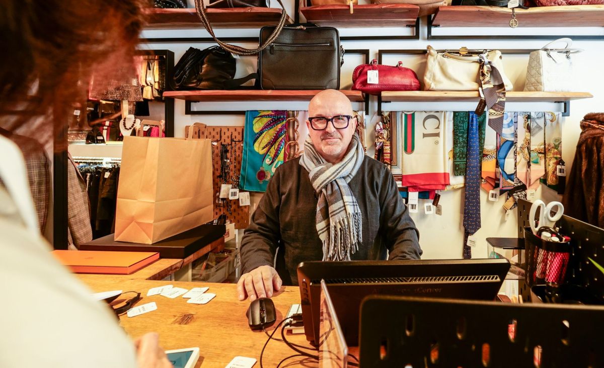 Die Co-Geschäftsinhaberin der Second-Hand-Läden Jil & Giorgio, Laura Peka, prüft einen Neueingang. Foto: Jon Duschletta