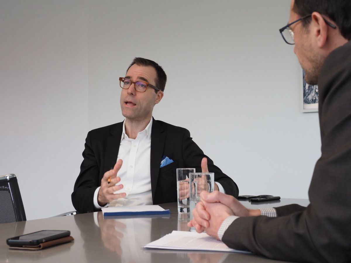 Maurus Blumenthal, Direktor BGV, diskutiert mit Nicolas Pernet, Direktor RTR, über die SRG-Initiative (Foto: David Truttmann).