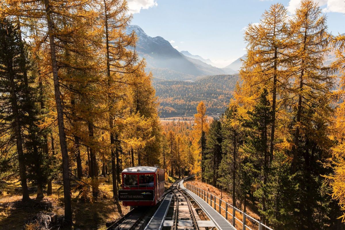 Die Muottas-Muragl-Bahn im herbstlichen Lärchenwald mit Blick auf die Oberengadiner Seenplatte. Beinahe schon ein Garant für touristische
