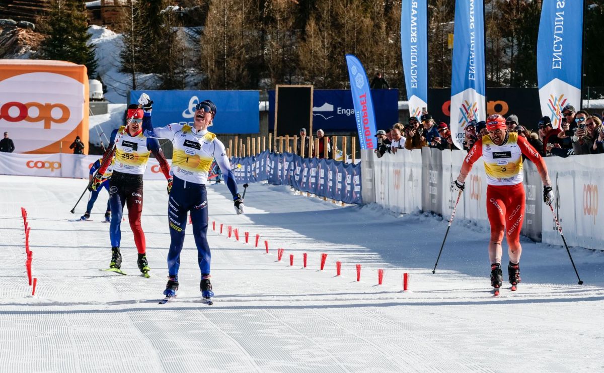 Hauchdünne Entscheidung bei den Männern. Von links: Der Dritte Sabin Coupat (FRA), Sieger Einar Hedegart (NOR) und der Davoser Jason Rüesch als Zweiter. Foto: Jon Duschletta