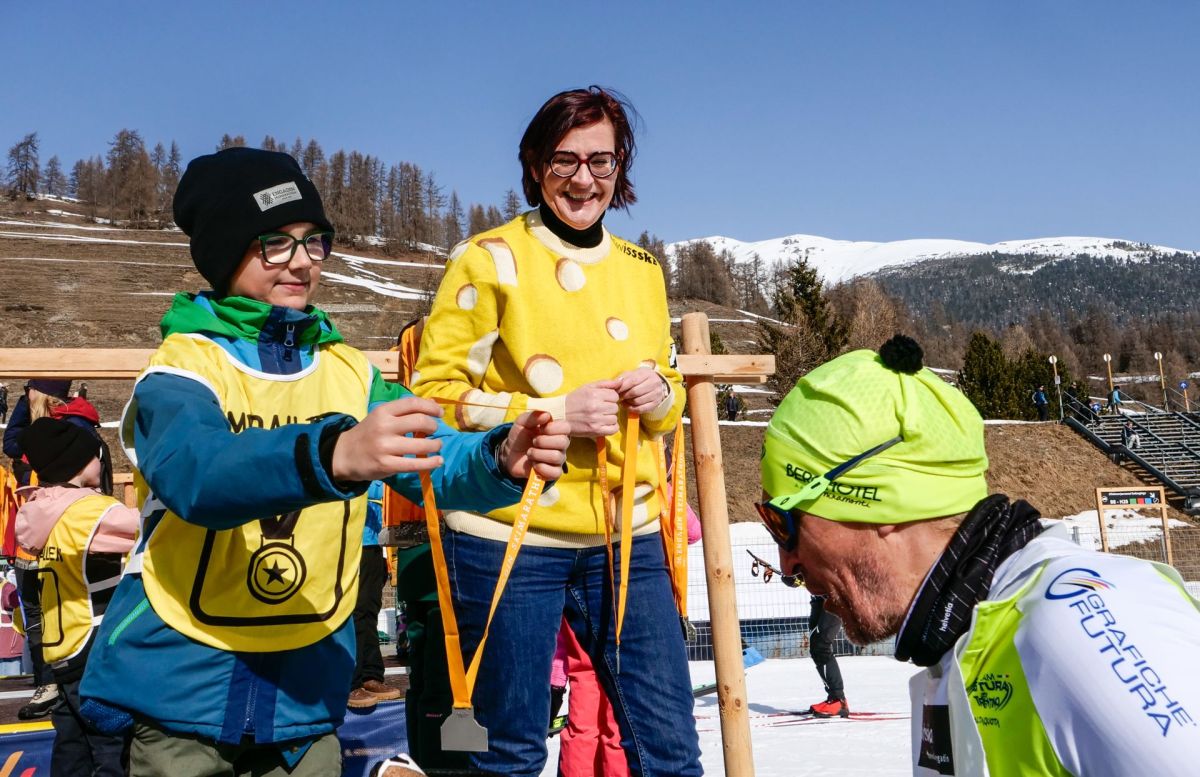 Die höchste Bündnerin, Standespräsidentin Valérie Favre Accola, händigte zusammen mit Kindern im Ziel Teilnehmenden Erinnerungsmedaillen aus. Foto: Jon Duschletta