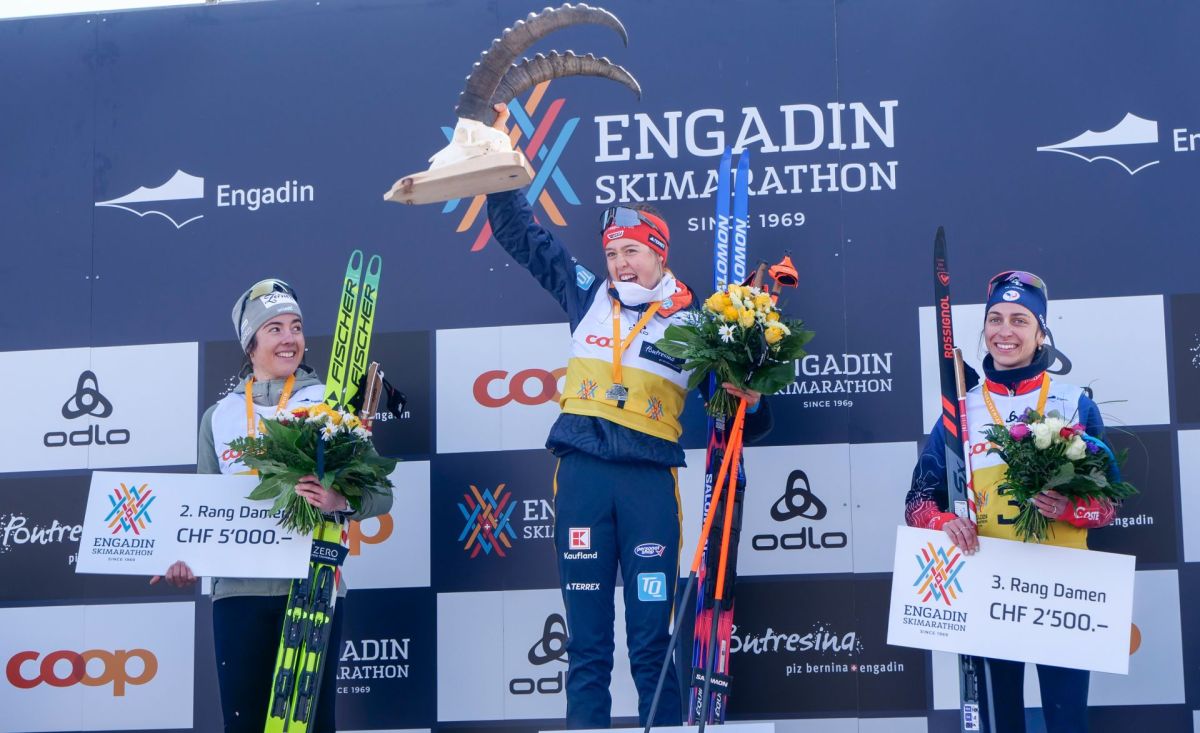 Das Frauen-Podest mit, von links: Lokalmatadorin Giuliana Werro aus Zernez als Zweite, der strahlenden Siegerin Anna Endress (GER) und Clémence Didierlaurent (FRA) als Dritte. Foto: Jon Duschletta