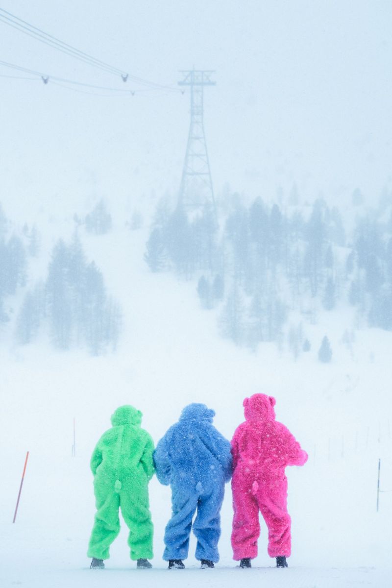 Drei Schneehäsli trotzdem dem Schneefall im Oberengadin (Foto: Logan Swney).