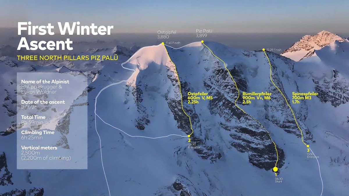 Zwei österreichischen Alpinisten ist am 8. März am Piz Palü in der Berninagruppe eine Erstbesteigung gelungen. Philipp Brugger und Lukas Waldner durchstiegen erstmals im Winter alle drei Nordwandpfeiler an einem Tag. Die beiden bewältigten den Bumillerpfeiler, den Ostpfeiler und den Spinaspfeiler in einer Gesamtzeit von 8 Stunden und 59 Minuten. Insgesamt legten sie dabei rund 2200 Klettermeter zurück. Während die Kombination der drei Pfeiler im Sommer bereits bekannt ist, galt eine solche «Wintertrilogie» bislang als nicht realisierbar.