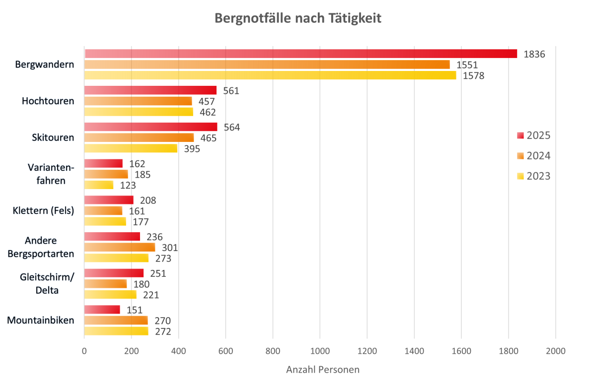 Auffällig ist, dass immer mehr Menschen unverletzt gerettet werden. Rund 1500 Personen wurden 2025 unversehrt geborgen. Viele von ihnen waren erschöpft, hatten sich verirrt oder kamen in schwierigem Gelände nicht mehr weiter. Dank Mobiltelefonen und gut organisierter Rettungsdienste kann heute schneller Hilfe gerufen werden, sodass Rettungen häufiger erfolgen, bevor es zu Verletzungen kommt.