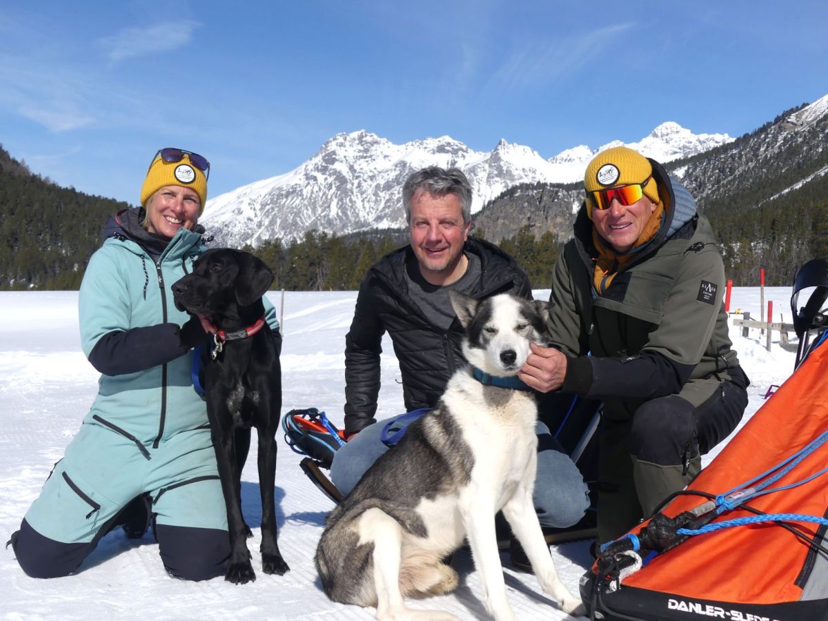 Babs Caduff, Peider Andri Toutsch e Roland Sum, insembel cun Pollux ed Orca (da schnestra) – insembel vöglian els render plü cuntschaint il sport da chans da schlitra (fotografia: Dario Müller).