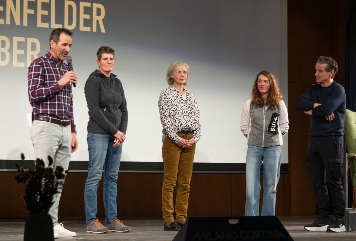 Engadiner Langlauflegenden: v.l.: Adriano Iseppi, Andrea Huber, Evi Mattmann-Kratzer, Nadj Kälin und Andi Grünenfelder. Foto: Jon Duschletta