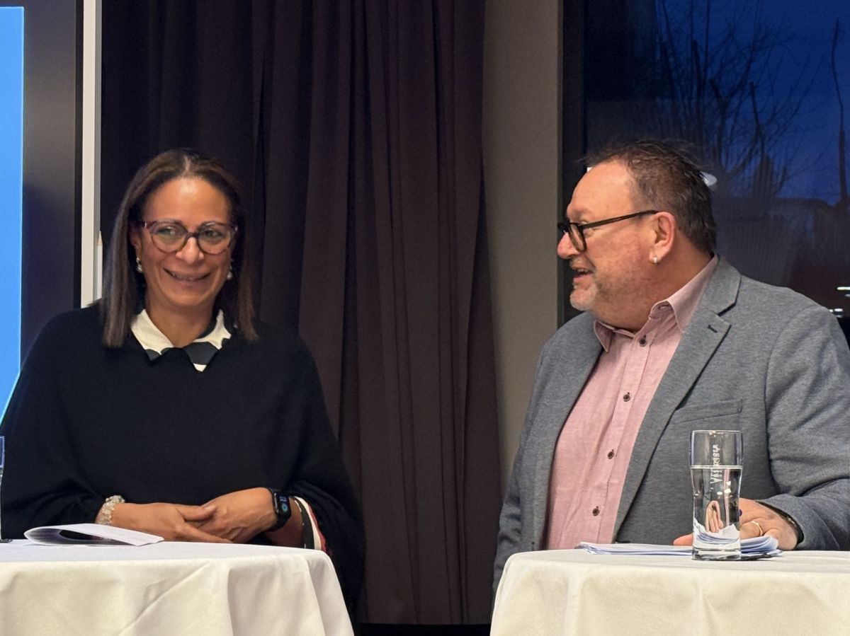 La presidenta cumünala da Val Müstair in discuors cul moderator. fotografia: Fadrina Hofmann
