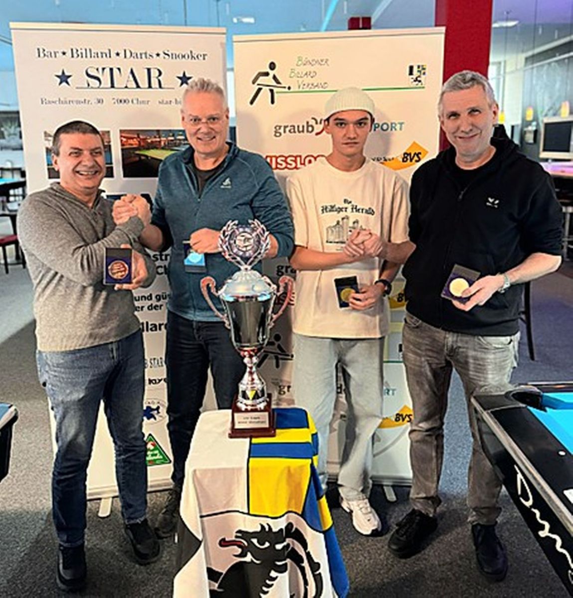 Der Anlass wurde vom Pool Club Star unter dem Patronat des Bündner Billard Verbandes organisiert wurde. Gespielt wurde im Doppel-K.o.-System auf fünf respektive vier Gewinnspiele. Der Bündner Teammeistertitel ging an Marco Rogantini aus Celerina ...