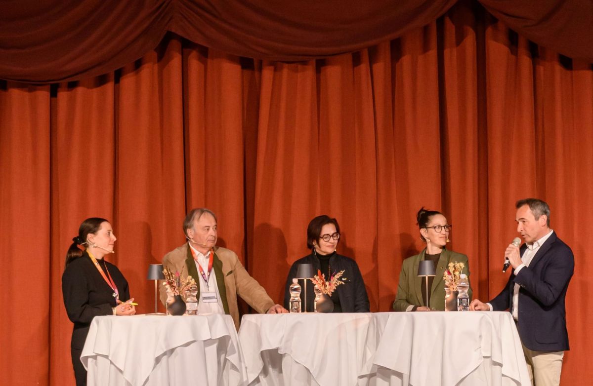Moderatorin Carmen Baumann, HEV-Präsident Martin Aebli, Standespräsidentin Valérie Favre Accola, Nora Saratz Cazin, Gemeindepräsidentin von Pontresina und Regierungspräsident Martin Bühler (von links). Foto: z. Vfg/FDP Oberengadin-Bregaglia
