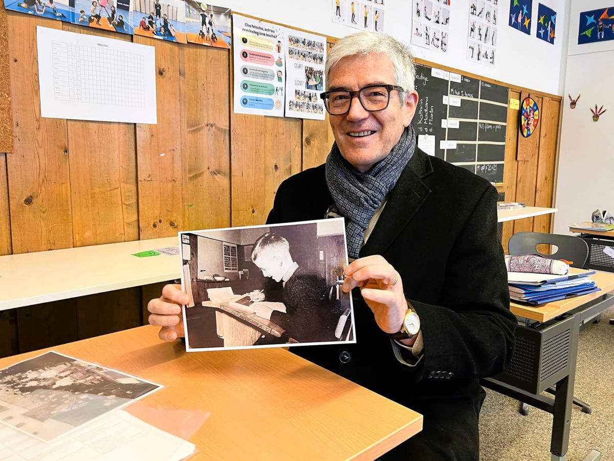 Il cusglier guvernativ Jon Domenic Parolini es tuornà illa stanza da scoula, ingio ch’el ha passantà avant 60 ons seis prüm di da scoula (fotografia: Departamaint d’educaziun Grischun).