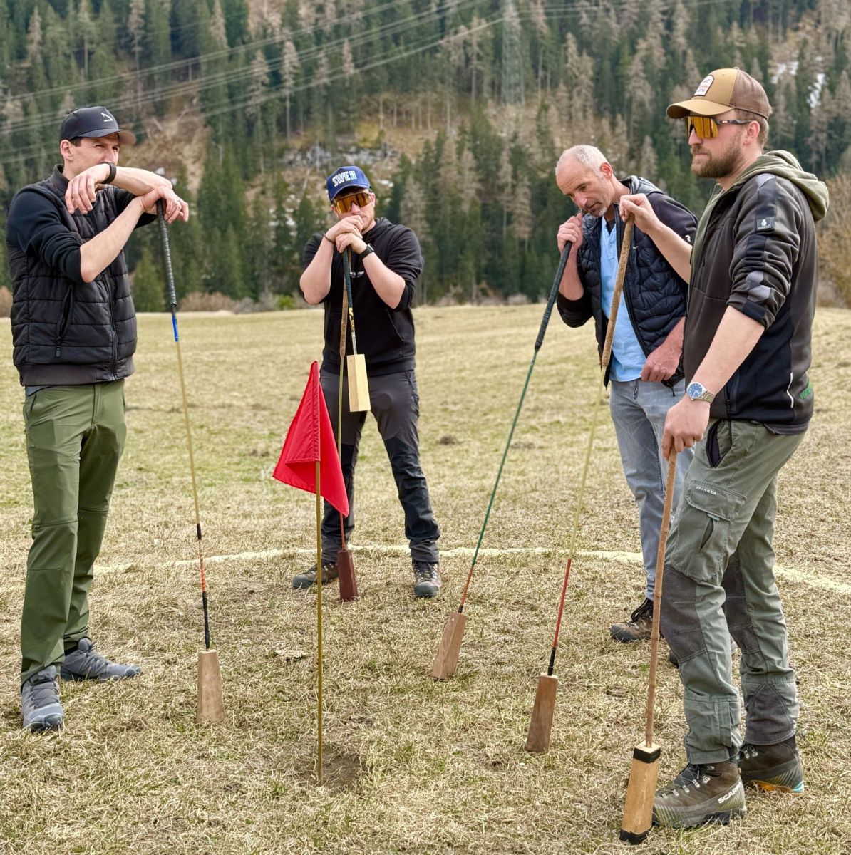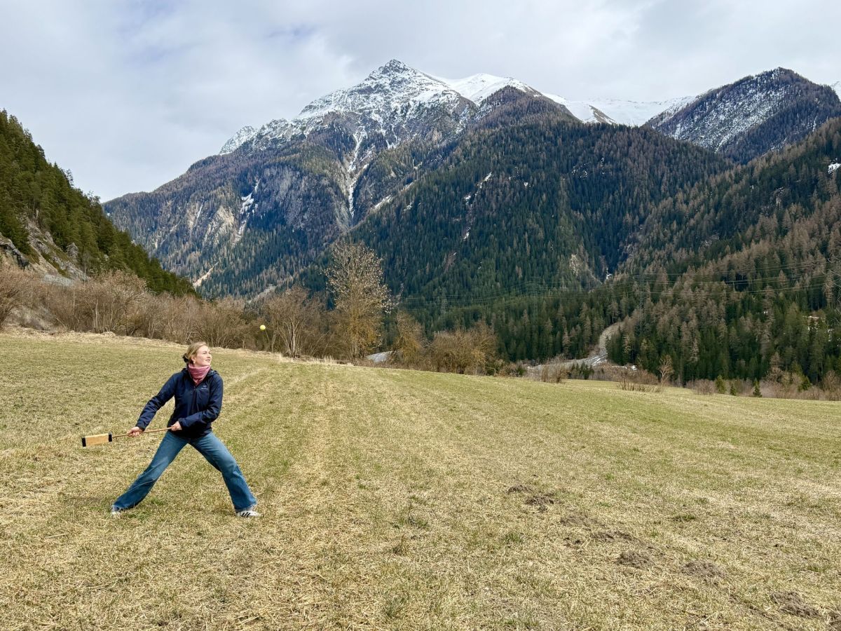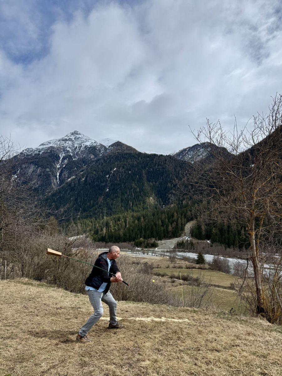 Die Schwierigkeit des Spiels beginnt auf jeden Fall schon ganz zu Beginn beim Abschlag, wie ich selbst erfahre. Es sieht deutlich einfacher aus, den Ball zu treffen, als es tatsächlich ist. Fünf Fehlversuche sind erlaubt – danach zählt es als einen Schlag. Bei den Geübten kommt dies wohl aber eher selten vor. Für die vier Ramoscher steht das jährliche «Mazlas» seit ihrer Kindheit auf dem Programm. Erlernt haben die Männer das Spiel in der Schule oder auch vom Grossvater. Auch heute ist es ein Fest, das Jung und Alt vereint. Letztes Jahr war der älteste Teilnehmer 82 Jahre alt und die Jüngsten erst im Kindergarten.