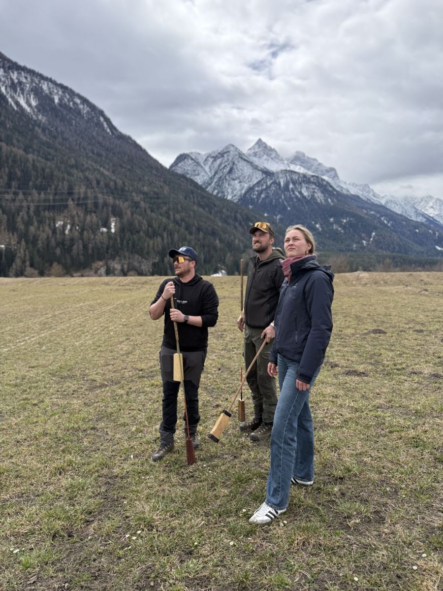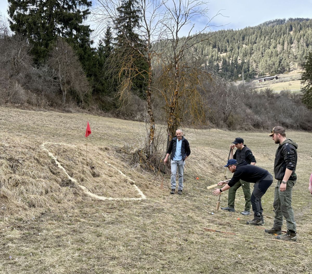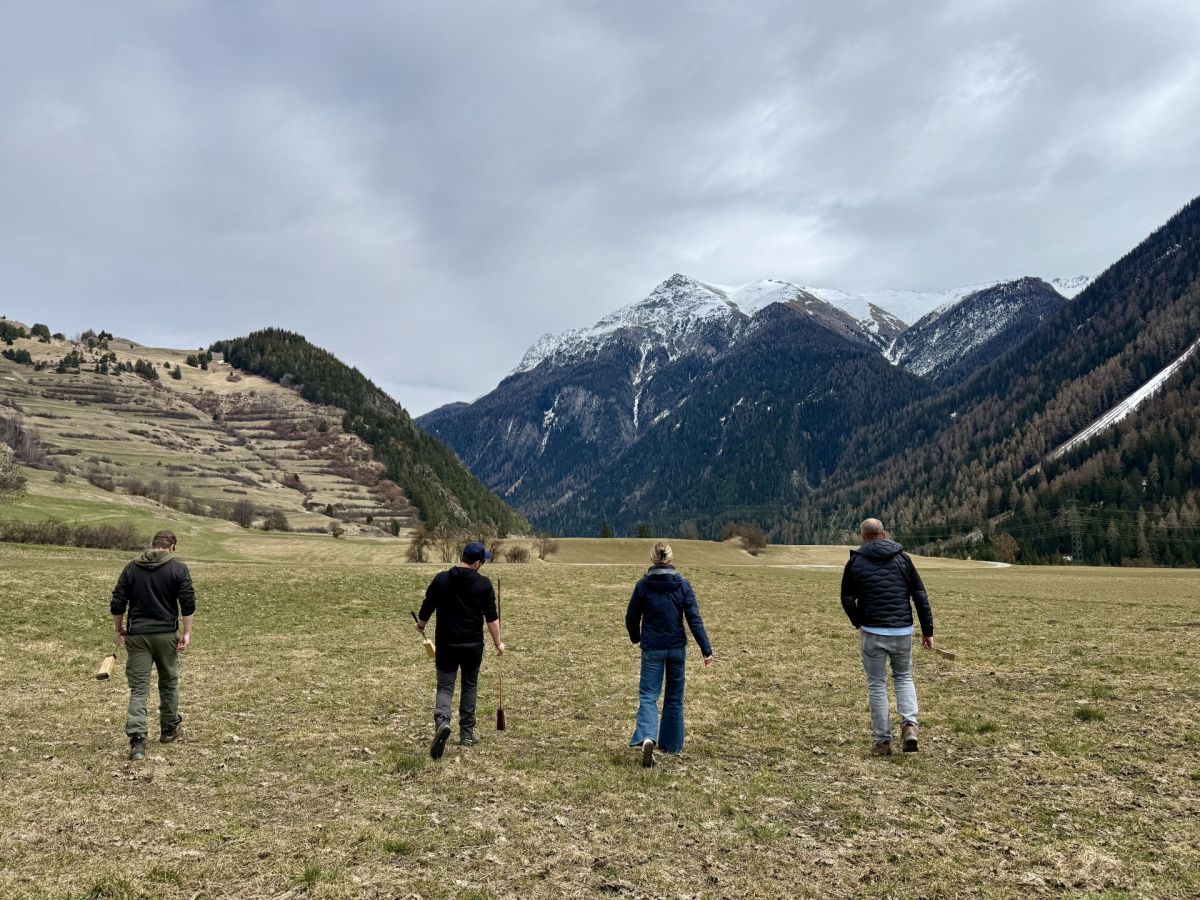 Es ist ein lauwarmer Frühlingsnachmittag Anfang April, als ich auf der Wiese unterhalb von Ramosch eintreffe, einem kleinen Ort im Unterengadin. Noch wirkt alles ruhig, doch in einer Woche wird sich dies ändern. Dann findet das Mazlas-Turnier statt. Heute treffen sich die Teilnehmenden zum Training.