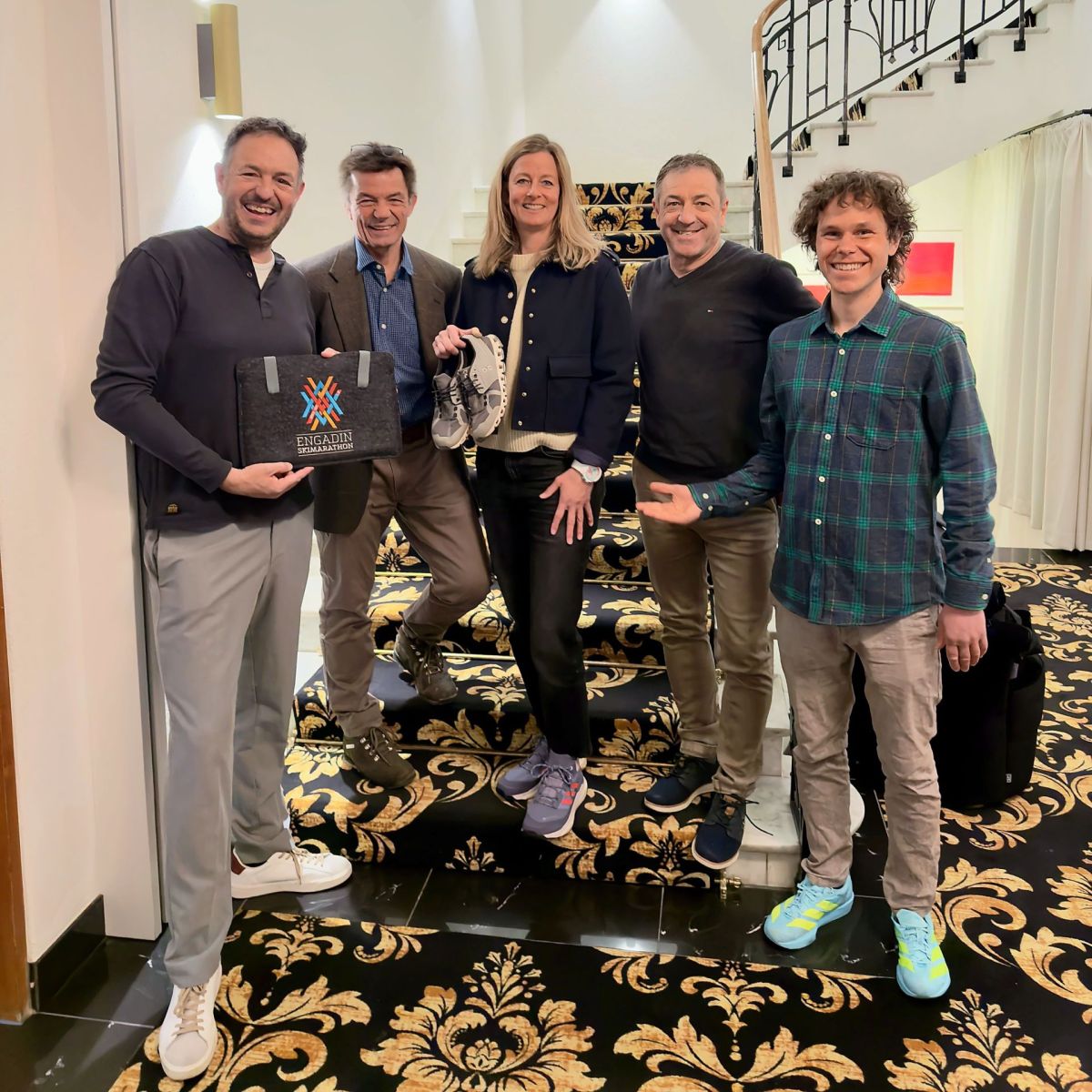 Von links: Menduri Kasper und Urs Pfister, Engadin Skimarathon, Anne-Marie Flammersfeld, Franz Späni und Geronimo von Wartburg, Verein Engadiner Sommerlauf. Foto: Engadin Skimarathon