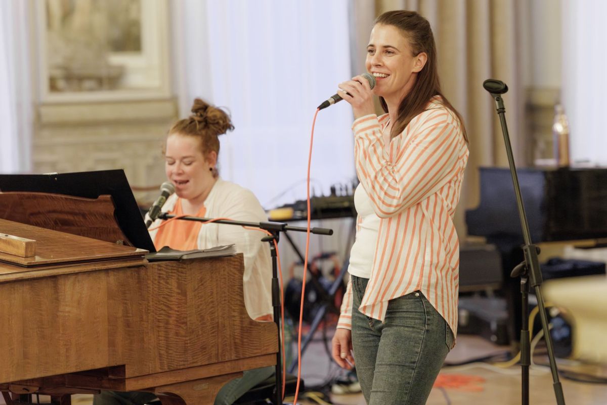 Eir Sidonia Caviezel e Nina Mayer da la fuormaziun Mi'Amia han chantà per la Büvetta (fotografia: Dominik Täuber)