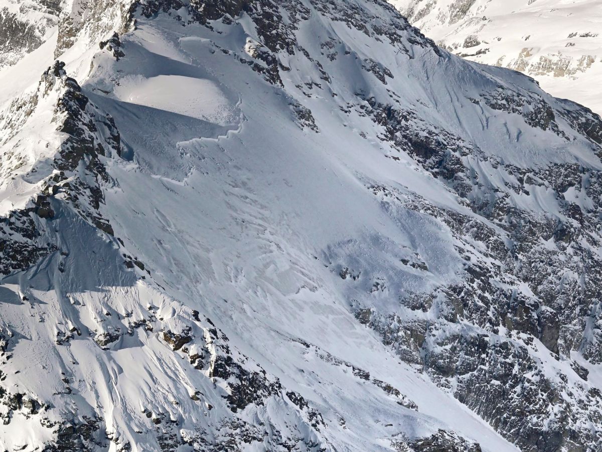 Erste, sehr grosse Lawinen, gingen mit den Schneefällen Ende November ab. Jedoch nur in hohen Lagen, dort, wo bereits flächig Altschnee lag – wie hier am Nordhang des Mutthorns (Lauterbrunnen, BE). Foto: SLF/N. Haehlen