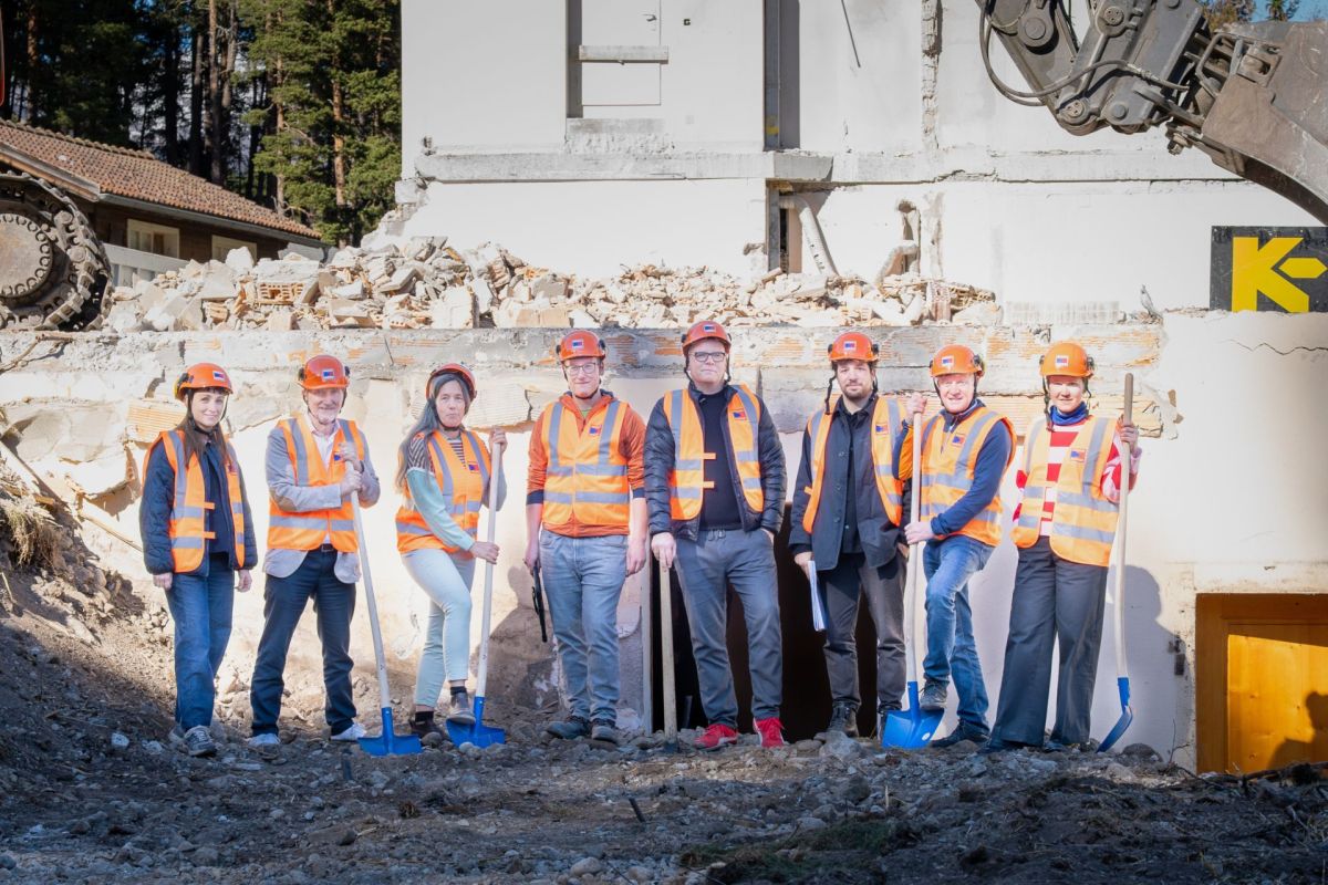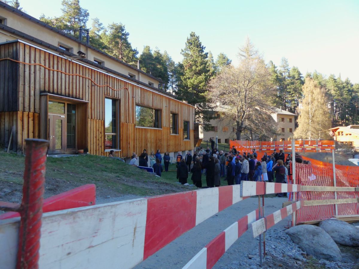 Üna fuolla d’interessats ha festagià insembel culs respunsabels la prüma badigliada da la modernisaziun da la scoula speciala ad Avrona sur Scuol. fotografia: Dario Müller