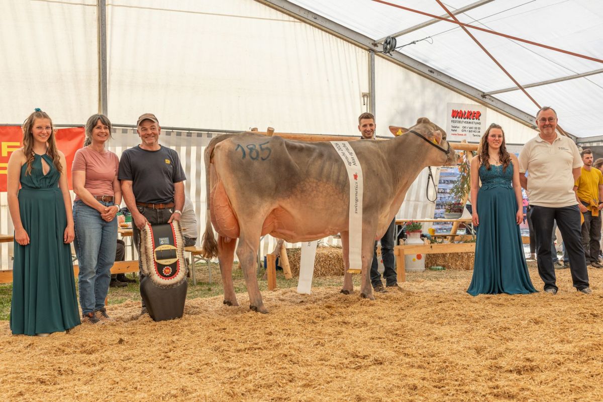 La vacha «Brice Belinda», la nouva «Miss Agrischa 2026», insembel cun seis possessurs Madlaina e Ludwig Noggler da Sent. fotografia: Hugo Studhalter